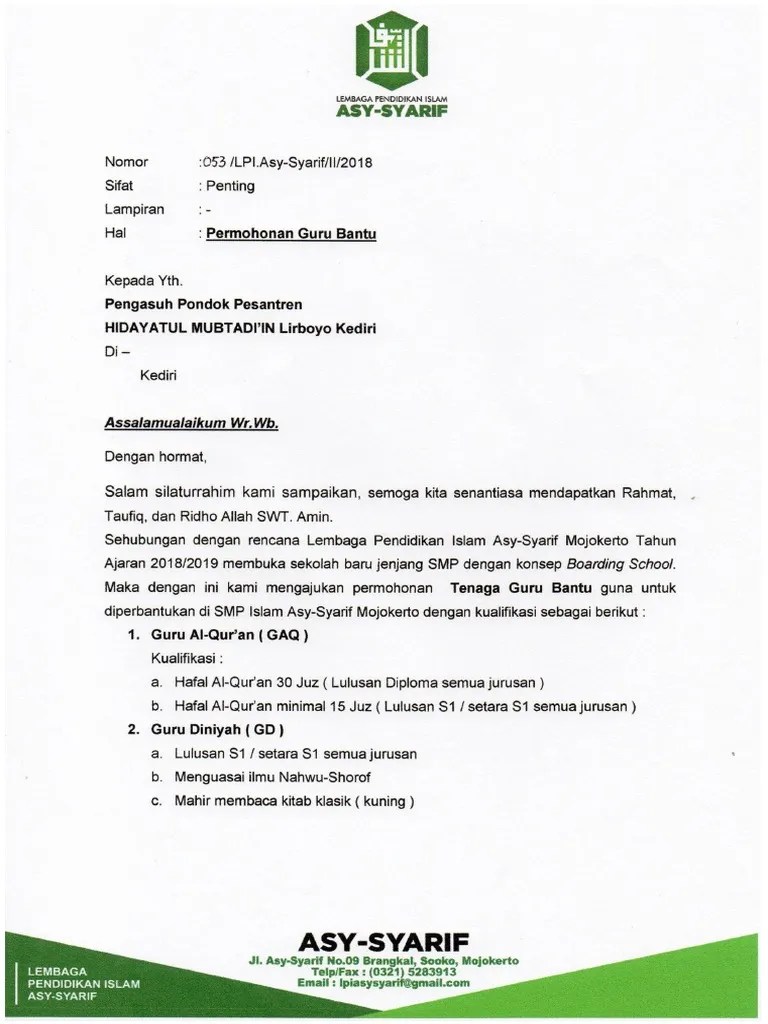 Observasi partisipasi kepala sekolah, guru, pengelola / yayasan dan orang tua; Bapak pimpinan pondok modern gontor. Guru pengabdian di pondok pesantren daar el istiqomah. Format surat tugas penelitian pengabdian dosen lppsdku. Penilaian kinerja guru / pegawai sma muhammadiyah wonosobo (form : Kajian manajemen di tk (kebijakan program, pelaksanaan dan hasil). Bahwa yang bersangkutan memang benar menjadi guru di madrasah ibtidaiyah nurul ihsan sejak tanggal 24 nopember 2006 sampai dengan saat surat . Diantaranya, mengajukan surat permohonan resmi, yakni berlogo, . Alumni s1/s2 unida gontor putri semua kampus (diutamakan guru kmi/ustadzah yang telah selesai pengabdian) untuk melanjutkan pengabdian dan Mereka dirasa memenuhi kebutuhan para pemohon, baik menjadi guru di. Demikian surat permohonan ini saya buat dengan sebenarnya, besar harapan saya akan diterimanya. Permohonan pengiriman santri (pengabdian) pondok modern. Permohonan pengabdian yang akan dilaksanakan pada: