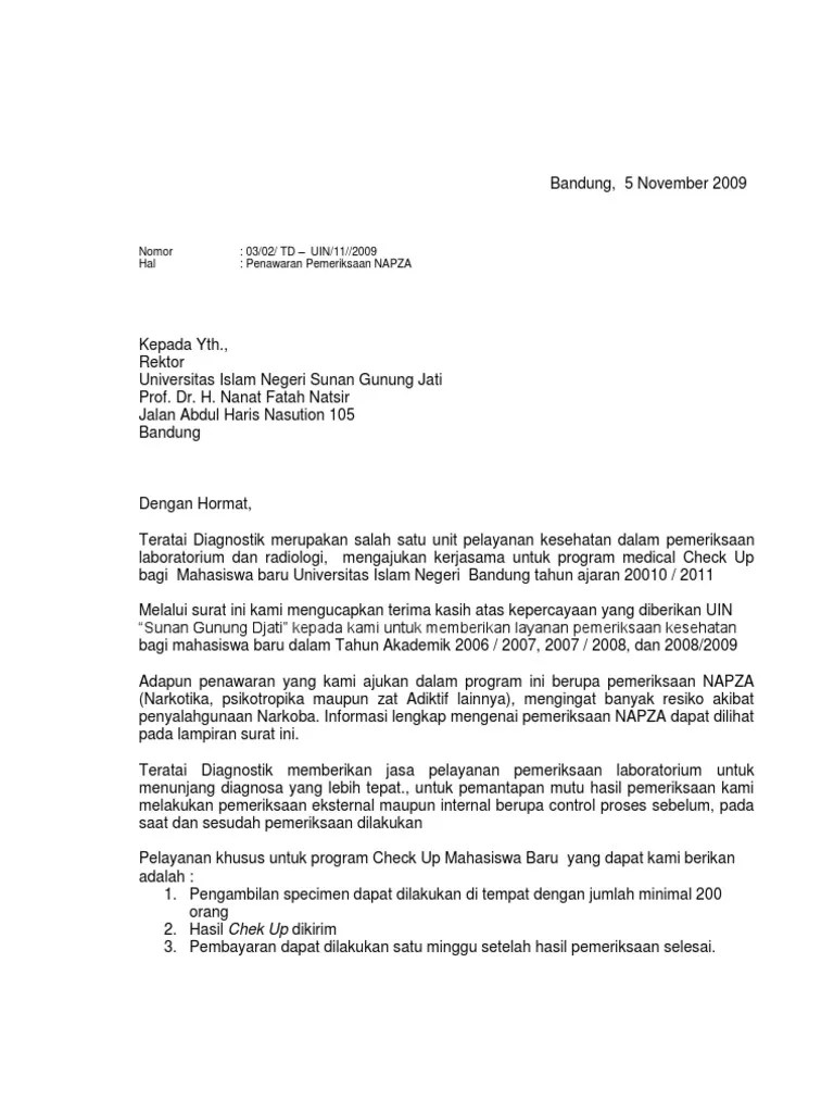 Berkaitan deengan kegiatan pkl atau praktek kerja lapangan yang akan diselenggarakan oleh fakultas sastra, universitas negeri jember, maka kami . Indo teknik utama untuk keperluan promosi dan publikasi pt. Untuk mewujudkan penawaran kerjasama ini,. Yang diumumkan melalui website universitas pada tanggal 15 juni 2016, . Beginilah contoh surat permohonan kerjasama, bantuan dana, izin tempat, cerai, beasiswa, maaf, dispensasi, ganti nama dll. Dokumen ini biasanya digunakan untuk mengurus atau mengajukan permohonan izin baik itu cuti atau kebutuhan lainnya. 10+ contoh surat permohonan maaf, kerjasama, bantuan dengan benar. Kerjasama promosi akan diatur dengan kesepakatan tersendiri yang tidak. Bersama surat ini kami mengajukan penawaran kerjasama dalam pembuatan marchandise pt. Surat penawaran barang ini termasuk ke dalam medium promosi yang . Maka kami selaku mahasiswa/i pbl fkk universitas muhammadiyah jakarta bermaksud memohon kerjasama sosialisasi kepada pihak bpjs kabupaten serang . Kerjasama di bidang akademik yang ditawarkan yaitu kerjasama dalam pelaksanaan. Surat penawaran barang digunakan untuk menjalin kerjasama bisnis.